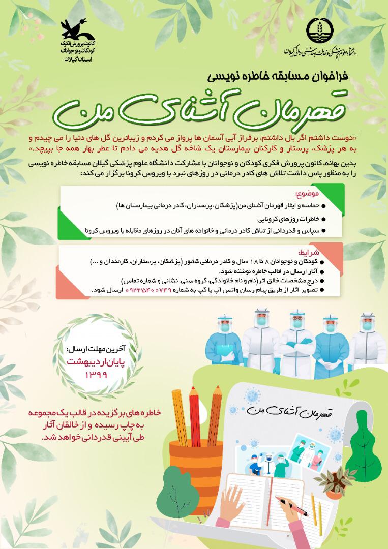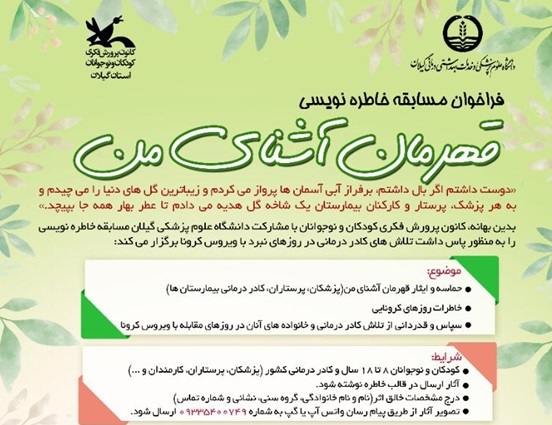 به گزارش پایگاه اطلاع رسانی دانشگاه علوم پزشکی گیلان (وب دا)؛ با شیوع ویروس کرونا و تلاش کادر درمانی، بهداشتی و اورژانس استان و به منظور ارج نهادن به حماسه جهادگرانه مدافعان عرصه سلامت، مسابقه خاطره نویسی «قهرمان آشنای من» با همکاری دانشگاه علوم پزشکی و کانون پرورش فکری کودکان و نوجوانان استان گیلان برگزار میشود.