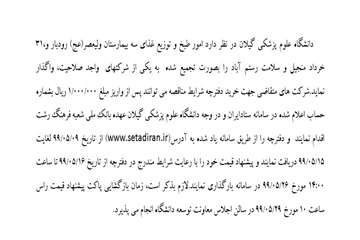 دانشگاه علوم پزشکی گیلان در نظر دارد امور طبخ و توزیع غذا در سه بیمارستان تابعه را از طریق مناقصه عمومی واگذار نماید.